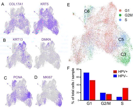 We determined the differentiation status and cell-cycle phase of epithelial subpopulations as previously described [39]. To this end, we probed for markers of embryonic/basal (COL17A+/KRT5+) (Figure 4A) versus differentiated (KRT13+/DMKN+) (Figure 4B) character, and markers of S (PCNA) (Figure 4C) and G2/M (MKI67) (Figure 4D) phase based on a well-defined set of markers for each [40,41]. This allowed the predominant differentiation state and cell-cycle phase(s) of each epithelial subpopulation to be defined and provide context into major biological processes that may appear in pathway analyses. We find that cells in S phase were predominately in C5, cells in G2/M phase in C3, and cells in C6 were in a mix of S and G2/M phases (Figure 4E). When broken down by HPV status, an increase in cells in S phase was observed for HPV+ vs. HPV− HNSCCs (Figure 4F).