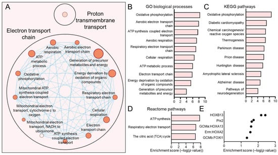 Gene ontologies of the HPV+ enriched C1 HNSCC epithelial subpopulation. (A) Cytoscape visualization of GO biological processes highlight genes related to the electron transport chain and aerobic respiration. Summary of top GO biological processes (B), KEGG pathways (C), and reactome pathways (D) demonstrates that the transcriptome of C1 centers on mitochondrial processes and ATP generation. (E) Transfac analysis for transcription factor drivers of the C1 subpopulation.
