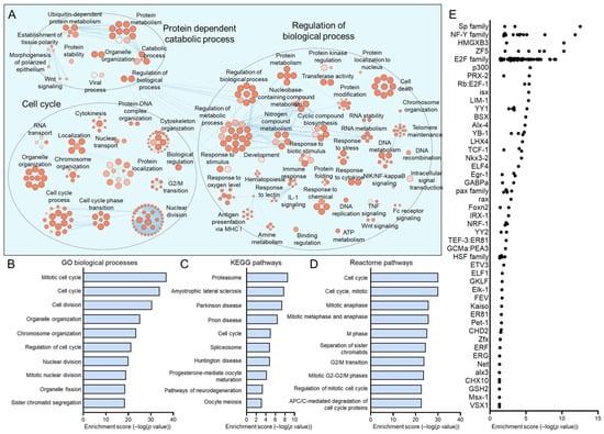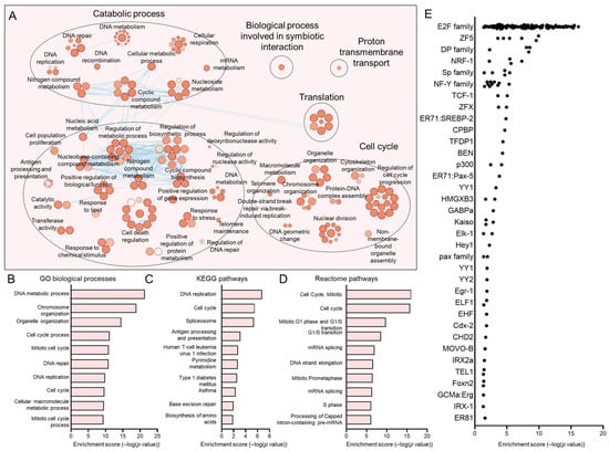 Gene ontologies of the HPV+ enriched C5 HNSCC epithelial subpopulation. (A) Cytoscape visualization of GO biological processes highlights pathways related to proliferation. Summary of top GO biological processes (B), KEGG pathways (C), and reactome pathways (D) centers on cell-cycle processes, particularly S phase. (E) Transfac analysis for candidate transcription factor drivers of the C5 subpopulation.
