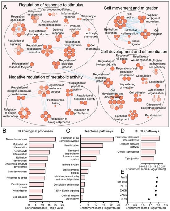 Gene ontologies of the HPV+ enriched C7 HNSCC epithelial subpopulation. (A) Cytoscape visualization of GO biological processes highlights pathways related to migration, development, and metabolism. Summary of top GO biological processes (B), reactome pathways (C), and KEGG pathways (D) include keratinocyte differentiation related processes. (E) Transfac analysis discover candidate transcription factor drivers of the C7 subpopulation.