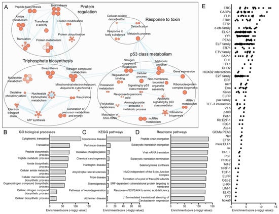 Gene ontologies of the shared C6 HNSCC epithelial subpopulation. (A) Cytoscape visualization of GO biological processes highlights pathways related to biosynthesis and p53. Summary of top GO biological processes (B), KEGG pathways (C), and reactome pathways (D) centers on translation and biosynthesis. (E) Transfac analysis for transcription factor drivers of the C6 subpopulation.
