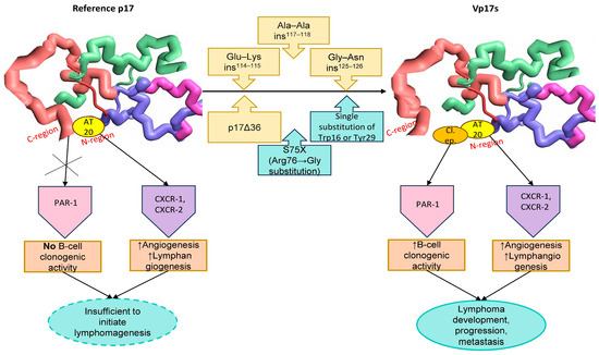 In proof-of-concept experiments, clonogenic vp17s derived from HIV-positive NHL patients, containing aa insertions at positions 117–118 and 125–126, had three positively charged aas—Arg15, Lys18 and Arg20—replaced with negatively charged Asp. Subsequent in vitro studies showed that these engineered vp17s, unlike their natural counterparts, no longer exhibited a clonogenic activity on B-cells. These findings imply that such critical residues are more exposed in vp17s compared to the reference p17, which may contribute to their newly acquired clonogenic effects on B-cells [25].