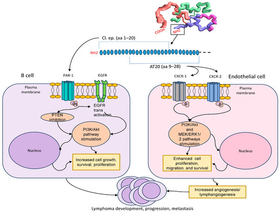 Additionally, the synthetic F1 peptide did not interact with the recognized receptors of the reference p17, chemokine (C-X-C motif) receptor (CXCR)-1 and CXCR-2, indicating that a different receptor might mediate the B-cell growth-enhancing effects of vp17s [25]. Subsequent studies identified this receptor as protease-activated receptor 1 (PAR1) [26], which is part of the extensive family of G protein-coupled receptors and is widely expressed on various cell types, including immune and epithelial cells, vascular myocytes and macrophages within the tumor microenvironment. Its activation contributes to the stimulation of the Akt pathway, which subsequently regulates the expression of several molecules, including RAC1, ABL1, p53 and CDK1, leading to enhanced cell proliferation, tumor progression and metastatic dissemination [26,27].