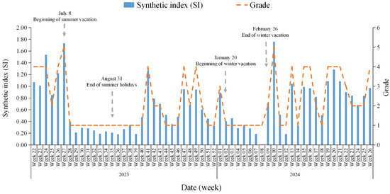 With reference to the experience of epidemiological-level classification of influenza [14,15,18,21] and the actual epidemiological status of NoV AGE in Chaoyang District, the epidemic intensity of NoV GII was divided into five grades. The intensity was increased from grade 1 to 5, corresponding to non-epidemic risk, general risk, moderate risk, high risk, and ultra-high risk, respectively. The median of the weekly SI of 0.52 was used as a threshold to distinguish between epidemic and non-epidemic periods. Based on the expert assessment and the characteristics of the surveillance data, 0.87, 0.92, and 1.71 were used as the cut-off values for classes 2 to 5, respectively (Table 1). If the synthetic index of two consecutive surveillance weeks in the epidemic season of 2023–2024 exceeds a certain threshold, an early warning for the corresponding epidemic intensity is issued and recommendations on corresponding control measures will be given. It is worth noting that mathematical models applied to epidemiological early warning all rely on historical surveillance data, but they cannot completely replace professional experience. Therefore, when making decisions based on the results of the various early warning models in practice, it is necessary to refer to the opinions of authoritative and experienced experts in the field. We should comprehensively consider various factors to avoid bias in the early warning model from affecting the misjudgment strategy.