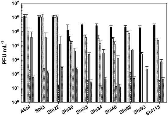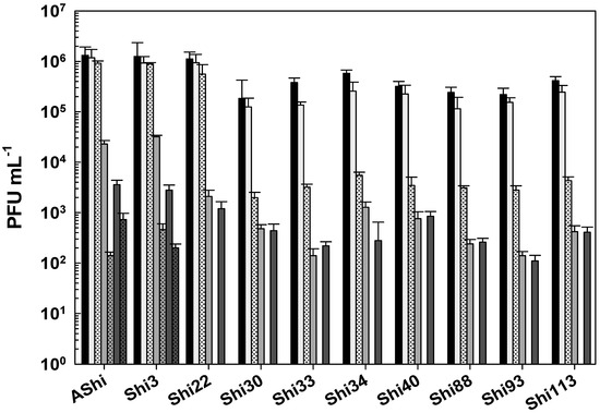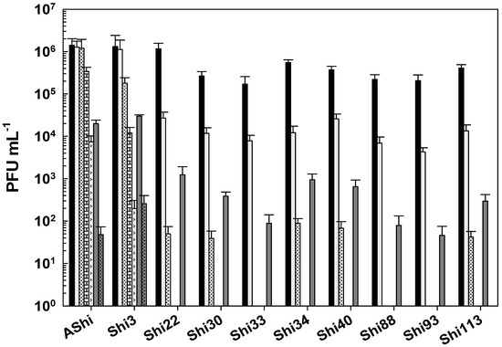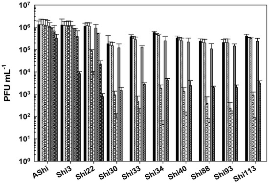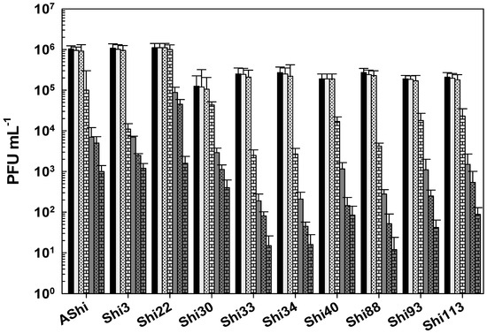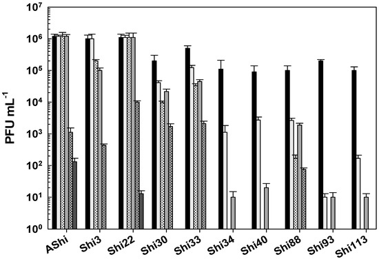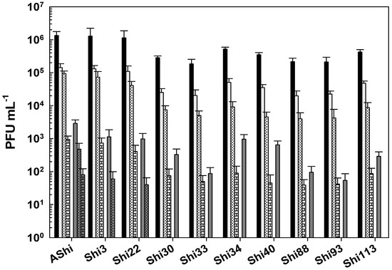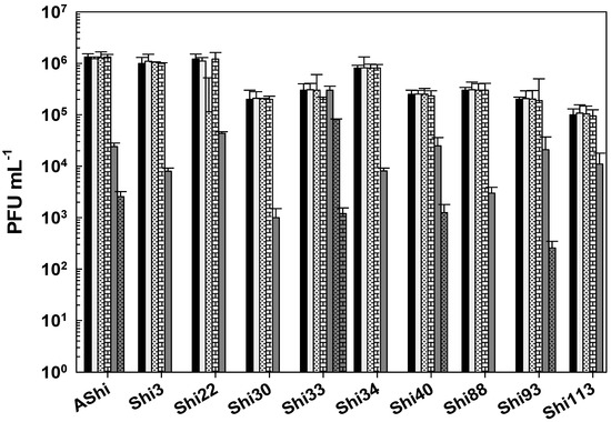Figure 5 shows the viability of Shigella phages against several concentrations of sodium hypochlorite. Six (AShi, Shi3, Shi22, Shi30, Shi33, and Shi88) out of the ten phages tested showed a high resistance to this biocide since they endured at concentrations up to 100 ppm for 10 min. Furthermore, particles of AShi (102 PFU mL−1) and Shi22 (101 PFU mL−1) were detected at the highest concentration of hypochlorite assayed after 1 min of incubation. On the other hand, Shi34, Shi40, Shi93, and Shi113 were the most sensitive ones to this biocide. Their viabilities were significantly affected after the shorter period of incubation (1 min) at the lowest concentration (50 ppm) assessed, and almost completely inactivated (101 PFU mL−1) after 1 min at 100 ppm.