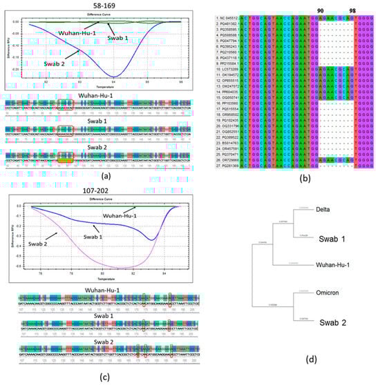 We performed a molecular genetic analysis on N protein RNA from two nasopharyngeal samples from patients with acute COVID-19, obtained in July 2021 (swab 1) and November 2021 (swab 2). The Wuhan reference RNA from the SARS-CoV-2 virus variant was used as a control. The graphs showed a clear difference in the melting patterns for the fragments of swabs 1 and 2 and the reference RNA (Figure 2a,b). In a swab obtained in November 2021, a characteristic deletion of subvariants from the Omicron lineage was detected (Figure 2a). In a multiple alignment analysis of the major SARS-CoV-2 variants, we found that this deletion was also detected in other Omicron variants (Figure 2b).