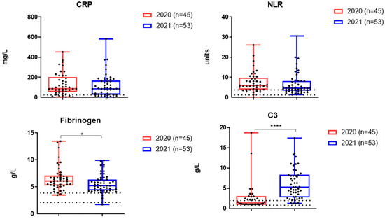 Serum C-reactive protein (CRP) and fibrinogen concentrations were determined by the turbidimetric method using BioSystem reagents (BioSystems, Barcelona, Spain). Interleukin-6 (IL-6), tumor necrosis factor alpha (TNF-α), or interferon 1 alpha (IFN-α) were determined using ELISAs (Vector-best, Novosibirsk, Russia) according to the manufacturer’s instructions. Serum complement C3 levels were measured using an ELISA kit (Cloud-Clone Corp., Wuhan, China) according to the manufacturer’s instructions. All blood samples were tested without heating. The neutrophil/lymphocyte ratio (NLR) was calculated based on clinical data from blood tests using the formula for absolute neutrophils/absolute lymphocytes.
