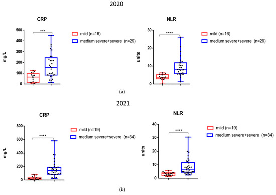 Considering that CRP and NLR levels were elevated in patients not only during the first wave of COVID-19 infection but also in late 2021, we analyzed these markers among patients with different degrees of severity (Figure 4a,b). It was found that in 2021, patients with moderate to severe COVID-19 disease had mean CRP and NLR levels that were also significantly higher compared to those with mild disease (Figure 4b).