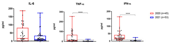 TNF-α and IFN-α levels were significantly lower among patients from the second cohort (Figure 5). However, IL-6 did not differ significantly between the two groups, and in most patients in the second group, it still significantly exceeded the reference levels (Figure 5).