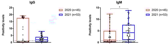 IgG seropositive rates were higher in group 1, while IgM levels were higher in group 2 (Figure 6).