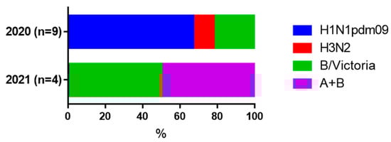 A separate issue is the aggravation of the clinical picture of COVID-19 due to coinfection with influenza viruses. In this regard, there was great similarity between the two examined cohorts. Since a 4-fold increase in HI antibodies is the ‘gold standard’ of seroconversion to influenza [29], the data obtained suggest that in moderate cases of COVID-19, coinfection with influenza viruses could possibly be present. The fact that in 2020 there were increases in the influenza A/H1N1pdm09 virus and in 2021 in the B/Victoria virus may coincide with the pattern of circulation of influenza viruses in the indicated epidemic seasons [39]. The problem of influenza and other respiratory infections in COVID-19 has been repeatedly discussed in the scientific literature. The fact that the incidence of seasonal influenza often coincides with an increase in the incidence of COVID-19 may negatively contribute to the clinical picture of coronavirus infection [40,41].