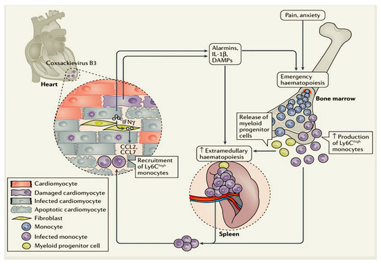 Illustration of cardiosplenic interface in coxsackievirus B3-induced myocarditis. Coxsackievirus B3 infection of cardiomyocytes causes cell death and the release of IL-1β and DAMPs, which trigger the recruitment and activation of innate immune cells. Pain, anxiety and danger signals trigger emergency blood cell production in the bone marrow. Myeloid progenitors then go to the spleen, where new monocytes are made to replace those used up in the damaged heart. Inflammation caused by IFNγ production in infected cardiomyocytes leads to increased CCL2 and CCL7 chemokine production, attracting monocytes to the heart. As the spleen is a target organ of Coxsackievirus B3 and monocytes are target cells of Coxsackievirus B3, the recruited Ly6Chigh monocytes could be infected with Coxsackievirus B3, thereby transporting the virus to the heart and further contributing to viral infection. Activation of the innate immune system in the heart is beneficial for its antiviral effects, but excessive or prolonged activation can lead to inflammation that triggers heart damage and remodelling, causing cardiac dysfunction. License Number 5960170460016; License date 1 February 2025.