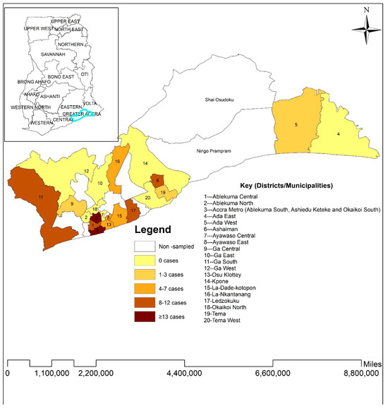 Distribution of SARS-CoV-2 infection using RT-PCR in the Greater Accra Region. Prevalence map shows the total number of individuals with RT-PCR positive status in 22 districts/municipalities.