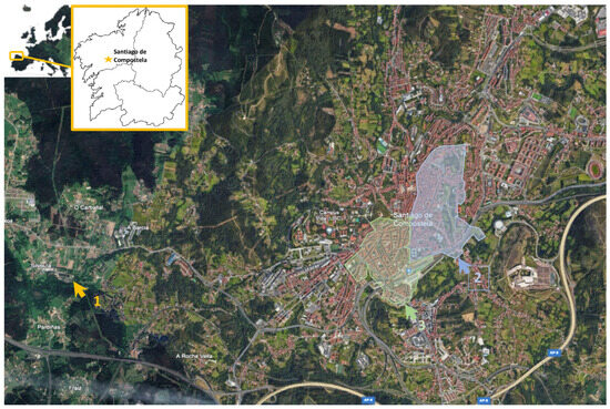 Geographic location of the study’s sampling locations (arrows) at Santiago de Compostela, A Coruña, Galicia, NW Spain. 1, WWTP; 2, SI-1; 3, SI-2. Source of color picture: Google Earth (data accession 17 March 2024).
