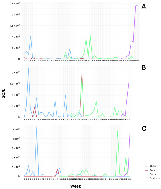 Mean quantification levels (GC/L) of Alpha, Beta, Delta, and Omicron VOCs per week (56 weeks) along the study in the WWTP (A), SI-1 (B), and SI-2 (C) samples analyzed.