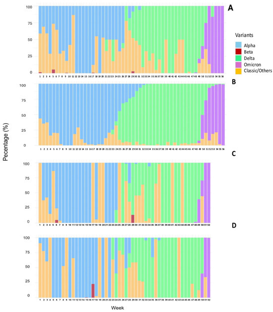 In parallel with the comparison of VOC concentrations across months, we also examined the variations in their proportions over the same period in WWTP samples (Figure 3; Supplementary Tables S4–S6). Alpha abundance showed a significant decrease (p-value < 0.05) from July 2021 to January 2022. The proportion of the Delta variant increased significantly (p-value < 0.05) in August–November compared to May and June 2021. Furthermore, the Delta proportion significantly decreased (p-value < 0.05) in January 2022 compared to the second half of 2021. The proportion of Omicron increased significantly (p-value < 0.05) in January 2022 compared to November and December 2021. Similarly to concentration levels, no significant differences were observed in the proportion of the Beta variant in WWTP samples across the 9 months during which this VOC was analyzed.