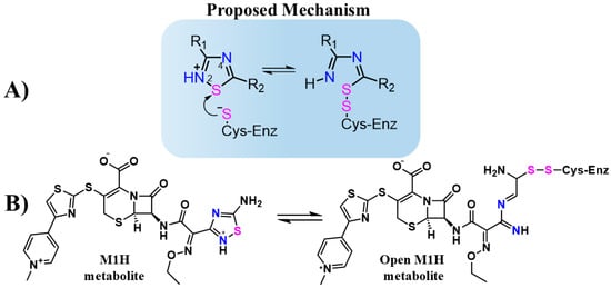 The chemical structures of the antibiotic CF and its metabolic scheme evaluated in this work. The structures of CF, its M1 metabolite, and its M2 metabolite were obtained from the DrugBank database []. The structures of M1H and M2H metabolites, were used to support the proposed mechanism for the inhibition of cysteine proteases by the 1,2,4-thiadiazole functional group []. The structures of open-M1H and open-M2H metabolites were determined, taking into account the proposed mechanism for the inhibition of cysteine proteases by the 1,2,4-thiadiazole functional group, after disruption of the aromatic ring and the interaction with the active sites. The 1,2,4-thiadiazole heteroatoms Sulfur (pink) and Nitrogen (blue)_are highlighted to emphasizes the proposed mechanism before and after the heterocycle opening.