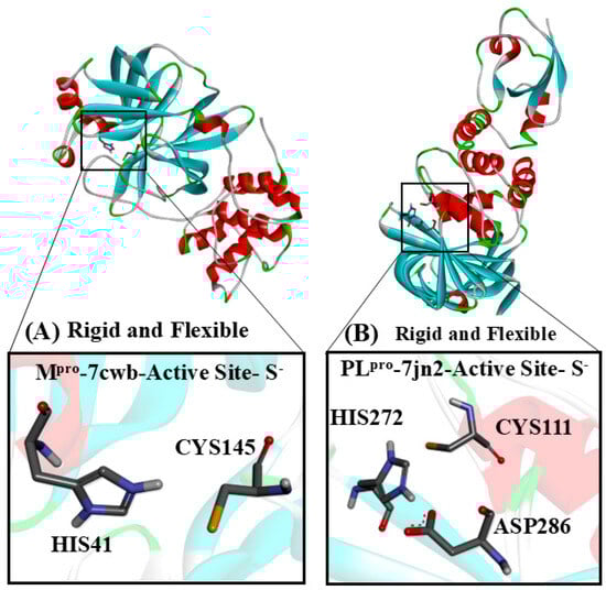 Auto Dock Vina 1.2.0 was used for flexible docking simulations in Mpro and PLpro active sites, according to the previous protocol []. Two flexible docking simulations were analyzed, one for the Mpro monomer (Mpro (Cys145 and His41 with flexible lateral chains) and one for PLpro (Cys111, His272, and Asp286 with flexible lateral chains). In both cases, the Cys amino acids were in the thiolate (S−) form, and the histidine was protonated. The hydrogens atoms of these specific amino acids were removed, and then using the CHIMERA program, 100 steps of energy minimization were carried out [].