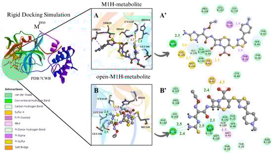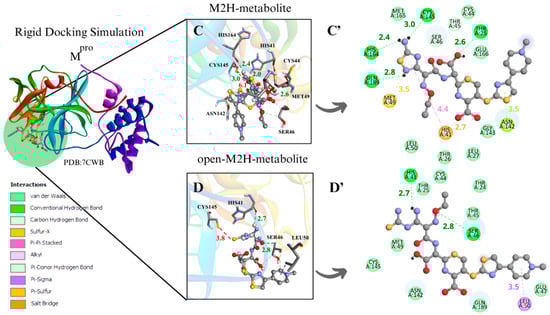 Rigid docking focused on active site with Cys and His charged in most favorable S···S interaction conformer. Mpro result compilation of 3D and 2D diagrams, with interaction distances between active site environment and ligands. (A) M1H metabolite 3D scheme, ∆G = −7.8 kcal·mol−1. (A’) M1H metabolite 2D scheme. (B) Open-M1H metabolite 3D, ∆G = −7.4 kcam·mol−1. (B’) Open-M1H metabolite 2D scheme. (C) M2H metabolite 3D scheme, ∆G = −7.5 kcal·mol−1. (C’) M2H metabolite 2D scheme. (D) Open-M2H metabolite 3D, ∆G = −6.9 kcal·mol−1. (D’) Open-M2H metabolite 2D scheme. Legend of intermolecular interactions is shown in bottom left corner. Distances are in Å. In order to optimize visualization of interaction of ligand with main amino acids of active site, some amino acids in environment are only highlighted in 2D visualization.