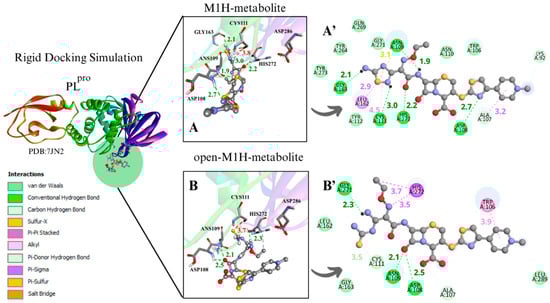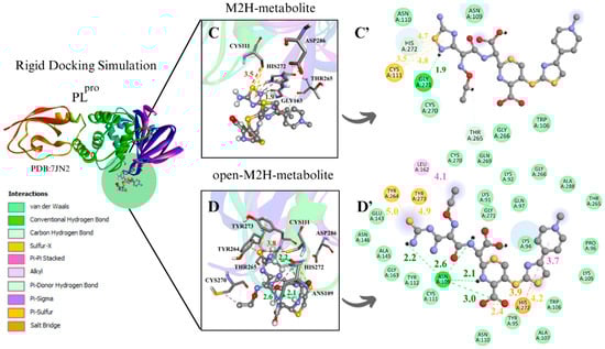 Rigid docking focused in the active site with Cys and His charged in the most favorable S···S interaction conformer. PLpro result compilation of 3D and 2D diagrams, with the interaction distances between the active site environment and the ligands. (A) M1H metabolite 3D scheme, ∆G = −5.6. (A’) M1H metabolite 2D scheme. (B) Open-M1H metabolite 3D, ∆G = −5.8. (B’) Open-M1H metabolite 2D scheme. (C) M2H metabolite 3D scheme, ∆G = −5.3. (C’) M2H metabolite 2D scheme. (D) Open-M2H metabolite 3D, ∆G = −5.4. (D’) Open-M2H metabolite 2D scheme. The legend of the intermolecular interactions is shown in the bottom left corner. Distances are in Å. In order to optimize the visualization of the interaction of the ligand with the main amino acids of the active site, some amino acids in the environment are only highlighted in the 2D visualization.