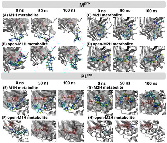 The RMSD plot for the Mpro ligands provides a visual representation of ligand stability and conformational dynamics within the protein’s binding pocket (Figure 6). Each colored trace corresponds to one of the four different metabolite states: M1H, M2H, open-M1H, and open-M2H (Figure 7). After the initial equilibration, the RMSD values for each metabolite reach a plateau, indicating that each ligand reaches a relatively stable conformation within the binding site of Mpro and PLpro. However, the degree of stability differs among the metabolites.