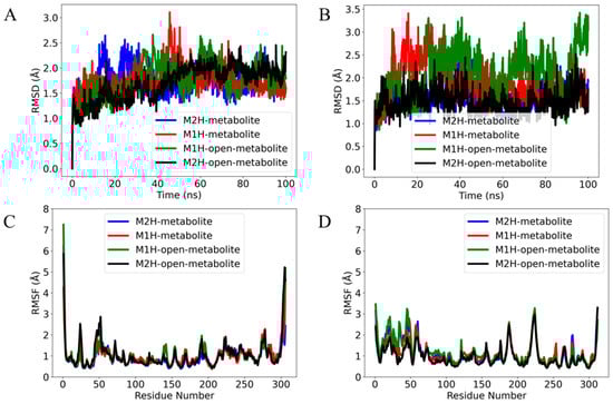The root mean square deviation (RMSD) of the α (alpha) carbon atoms of the complexes in (A) Mpro and (B) PLpro over a 100 ns production time. The RMSD values are calculated with respect to each metabolite’s conformation at 0 ns production time. The root mean square fluctuation (RMSF) of (C) Mpro and (D) PLpro residues in response to binding different metabolite states over a 100 ns molecular dynamics simulation. The plot displays the evolution of the RMSD and RMSF for four metabolite complexes: M2H (blue), M1H (red), open-M1H (green), and open-M2H (black).
