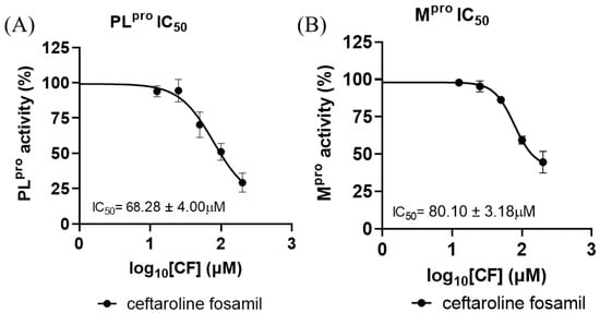 To substantiate the in silico results, the inhibitory potency of CF was tested with SARS-CoV-2 proteases (Figure 8). CF inhibited PLpro with an IC50 of 68.28 ± 4.00 μM and Mpro with an IC50 of 80.10 ± 3.18 μM (Figure 8A,B). According to the results obtained in this work, the enzyme with the best inhibition rate is PLpro. This result corroborates findings previously reported by Delgado et al. in a molecular dynamics study, where it was verified that there are greater interactions and shorter distances between the 1,2,4-thiadiazole group of M1 and the Cys of the active site of PLpro []. However, the inhibitory potency of CF was higher than that reported from in vitro tests against the Mpro and PLpro enzyme [,,]; ebselen, for example, inhibits Mpro with an IC50 of 0.67 μM and PLpro with an IC50 of 2.35 μM, while disulfiram inhibits Mpro and PLpro with an IC50 of 2.45 μM and 13.06 μM, respectively [,]. Nirmatrelvir, one of the combined protease inhibitors used for Paxlovid, approved for COVID-19, inhibits Mpro with an IC50 of 19.2 nM [,,].