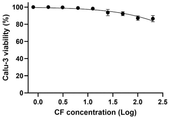 Calu-3 cells (1.5 × 104 cells/well) were cultured in a 96-well plate (Kasvi, São José dos Pinhais, PR, Brazil) and treated with a concentration gradient of CF (0.8, 1.6, 3.1, 6.3, 12.5, 25, 50, 100, and 200 µM) for 72 h at 37 °C in a 5% CO2 atmosphere. CF was initially dissolved in 100% dimethyl sulfoxide (DMSO; Nova Biotecnologia, Cotia, SP, Brazil) to achieve a final concentration of 0.1% (v/v) upon dilution in DMEM, ensuring no adverse effects on Calu-3 cell growth or metabolism []. Following the treatment period, cytotoxicity was assessed using methylene blue staining to determine the percentage of viable cells []. Post-treatment, the cells were washed with saline solution, fixed, and stained for 1 h at 37 °C in 5% CO2 with a methylene blue solution (Hank’s balanced salt solution (HBSS), 0.6% methylene blue, and 1.25% glutaraldehyde). After staining, the solution was removed, and the plate was washed and dried at room temperature. An elution solution (49% PBS, 50% ethanol, and 1% acetic acid) was added, and the plate was incubated for 15 min at room temperature. The supernatant of the stained cultures was then transferred to a new 96-well plate and analyzed at a wavelength of 660 nm using a spectrophotometer (Loccus LMR-96i-4, São Paulo, SP, Brazil). The 50% cytotoxic concentration (CC50) of CF was determined by comparing the treated cells to the untreated control cells [].