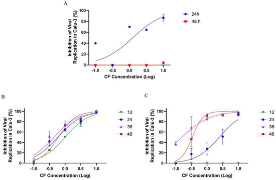 The inhibition of viral replication was assessed in monolayers of Calu-3 cells (1.5 × 104 cells/well) infected with SARS-CoV-2 at a multiplicity of infection (MOI) of 0.01 or 0.1 for 1 h at 37 °C in a 5% CO2 atmosphere. Subsequently, the cells were treated with a semi-log concentration gradient of CF (0.1, 0.316, 1, 3.16, and 10 µM) for 12, 24, 36, and 48 h. At 12 h intervals, 20 µL of the supernatants was collected and stored at −80 °C for virus titer determination. To maintain the initial concentration, a new pulse of treatment with the same volume was added to the cells, completing the treatment at 48 h. For virus titration, Vero E6 cells at a density of 1.0 × 104 cells/well were incubated with the harvested supernatants at various dilutions (1:100 to 1:12,800) for 1 h at 37 °C in a 5% CO2 atmosphere. Following this incubation, 50 µL of carboxymethylcellulose medium (CMC) at 2.4% (DMEM 10x, sodium bicarbonate 0.22%, FBS 2%, penicillin 1%, and streptomycin 1%) was added to each well, and the cells were cultured for 72 h under the same conditions. The cells were then fixed with 4% formalin for 3 h, washed, and stained with 0.04% crystal violet for 1 h []. Viral titers were determined by counting plaque-forming units (PFU) and expressed as PFU/mL.