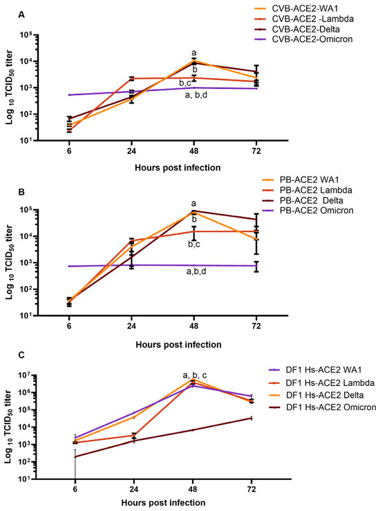 2.10. Infection and Replication Dynamics of SC2 and Variants in CVB-ACE2, PB-ACE2 Cell Lines