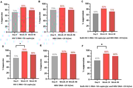 Primary and secondary efficacy results for the intention-to-treat population (N = 28) and the per-protocol population. (A–C) graphically illustrate the proportions of HIV-1 viral suppression (A), HBV viral suppression (B), and combined HIV-1 and HBV suppression (C) in the intention-to-treat (ITT) population. (D–F) graphically illustrate the proportions of HIV-1 viral suppression (D), HBV viral suppression (E), and combined HIV-1 and HBV suppression (F) in the per-protocol (PP) population. * indicates statistical significance at p-value < 0.05, as determined using two-tailed exact McNemar test. Legend: HIV-1—human immunodeficiency virus-1; HBV—hepatitis B virus; IU/mL—international units per milliliters.