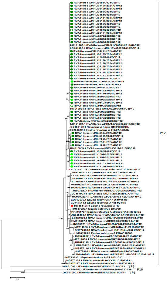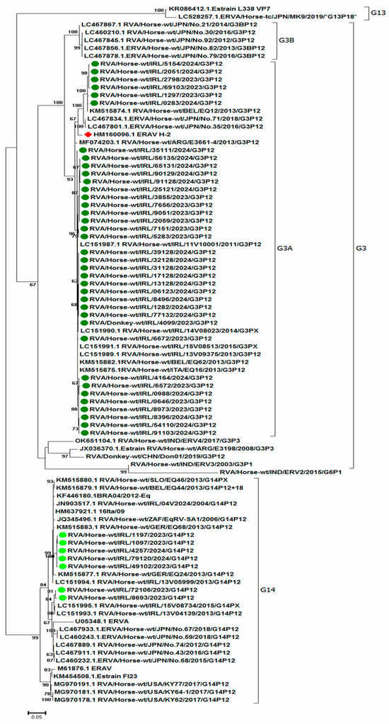 Phylogenetic analysis of 90 nucleotide sequences (763 bp) of the VP7 gene of group A rotaviruses (RVAs). Irish equine G3P[12] and G14P[12] RVAs examined in this study are indicated by dark and light green circles, respectively. The H-2 strain is indicated by a red diamond. The percentage of bootstrap support is indicated by the value at each node. Scale bars indicate nucleotide substitutions per site. *G13P[18] viruses are rarely detected in horses.