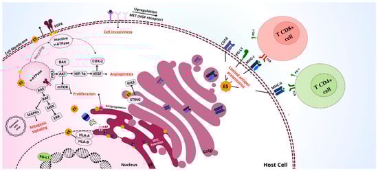 The E6 and E7 oncoproteins interact with various signaling pathways, such as the PI3K/AKT pathway, promoting a stem cell phenotype in esophageal squamous cell carcinoma, and the JAK/STAT pathway, which is overexpressed due to HPV action in various cancers [,]. In recent years, the E5 protein has been extensively studied due to its role in immune evasion, cell growth, and therapy resistance, making it another important mechanism by which HPV can modulate the tumor microenvironment [,].