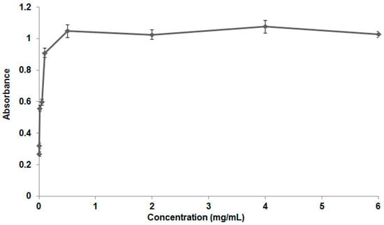 In order to determine the critical micellar concentration of the poloxamer used in this paper, a methodology adapted from Samith et al. (2013) was used []. For this purpose, the dye solubilization method was performed, followed by reading using a spectrophotometer. Poloxamer 407 solutions in water varying from 0.001 to 6 mg/mL were produced, and the dye used to determine micelle formation was Sudan Black. Thus, 5 mg of Sudan was solubilized in 5 mL of Pluronic solution and subsequently analyzed in a spectrophotometer at 656 nm (maximum wavelength of the dye). This study was carried out at room temperature (25 °C), and the absorbance results obtained were used to create an absorbance versus poloxamer concentration graph.