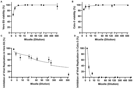 Viability of Vero E6 and Calu-3 cells in the presence of micelles and micelles inhibition of SARS-CoV-2 replication with different magnitudes in the cell models tested. (A) Vero E6 cells (1 × 104 cells/well) or (B) Calu-3 cells (2 × 104 cells/well) were exposed to micelles in different 1:X ratios (X = 2, 4, 8, 16, 32, 64, 128, 256, or 512) and kept at 37 °C, 5% CO2 for 72 h. The viability of Vero E6 and Calu-3 cells was assessed by LDH dosage; the positive control of the assay was lysed cells (1× lysis solution). (C) Vero E6 cells (1 × 104 cells/well) or (D) Calu-3 cells (2 × 104 cells/well) were infected with SARS-CoV-2 (MOI: 0.01) for 1 h at 37 °C and 5% CO2. The supernatant was then removed, and the cells were exposed to the micelles in different 1:X ratios (X = 2, 4, 8, 16, 32, 64, 128, 256, or 512) and kept at 37 °C, 5% CO2 for 24 h. Viral titer was determined by plaque assay. The x-axis refers to the dilution factor applied in the experimental setup. Data are represented as mean ± SD of 6 experiments, and graphs were created using GraphPad Prism 10.1.1 software.