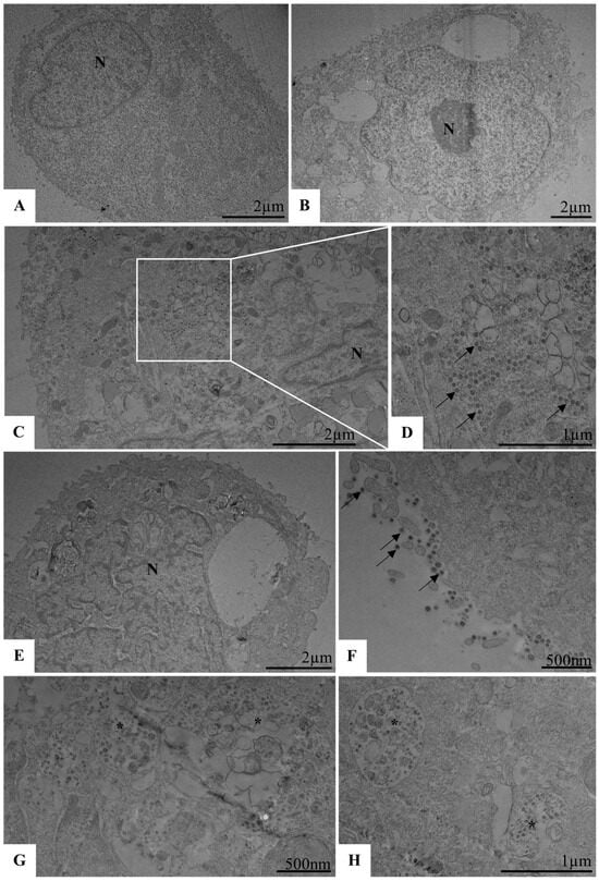 Ultrastructural analysis of Calu-3 cells infected with SARS-CoV-2 (MOI 0.01) and treated with micelle (1:2). (A,B) uninfected and untreated Calu-3 cells (control cell). (C,D) Calu-3 cells infected with SARS-CoV-2 (virus control); note the presence of SARS-CoV-2 particles inside the cytosol (arrows). (E) Calu-3 cell treated with micelle (micelle control). (F–H) Calu-3 cells infected with SARS-CoV-2 and exposed to the micelle; note the presence of defective SARS-CoV-2 particles in the lumen of cytosol vesicles (asterisk). N (Nucleus), SARS-CoV-2 particles (arrows).