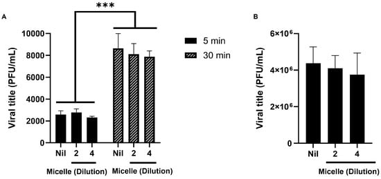 We investigated whether the micelles could interfere with the early infection’s steps of SARS-CoV-2 replication. To this end, the micelles were diluted in different proportions (1:2 or 1:4) and then received viral particles. After 5 and 30 min of interaction, viral titration was performed in Vero E6 cells. The results showed that the pre-exposure of the virus with the micelles did not interfere with the viral infective capacity, since the viral titration of the pre-exposed virus did not differ significantly from the unexposed virus control (Nil) (Figure 5A).