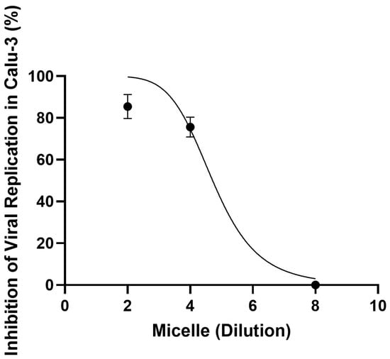 Pre-treatment of cells with the micelles inhibited SARS-CoV-2 replication. Calu-3 cells (2 × 104 cells/well) were treated with the micelles in different proportions (1:2, 1:4, or 1:8) at 37 °C, 5% CO2 for 1 h. The medium was then changed to one containing only SARS-CoV-2 (MOI: 0.01), and the cells were incubated at 4 °C for 1 h. After this period, the medium was changed to one containing only 10% SFB. After 24 h, the supernatant was collected, and the viruses were titrated by plaque assay. The x-axis refers to the dilution factor applied in the experimental setup. Data represent the mean ± SD (n = 8).