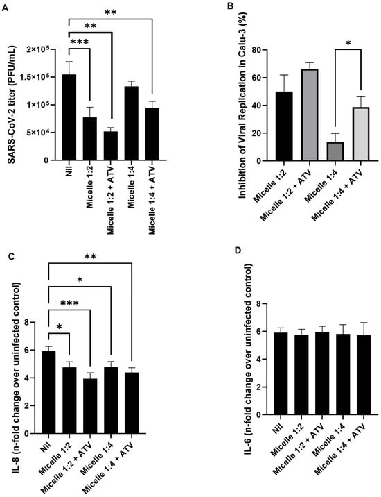 Calu-3 and Vero E6 cells were infected with SARS-CoV-2 at a multiplicity of infection (MOI) of 0.01 for 1 h at 37 °C with a 5% CO2 atmosphere. After this period, the supernatant was replaced by another containing different proportions of the 1:X micelles (X = 2, 4, 8, 16, 32, 64, 128, 256, or 512). After 24 h, the supernatant was collected, and the viruses grown in the presence or absence of micelles were titrated by plaque-forming units’ assay. Alternatively, Calu-3 cells were infected at a multiplicity of infection (MOI) of 2.0. After 1 h, the culture medium was replaced with fresh medium containing nanomicelles at 1:2 or 1:4 dilutions with or without ATV sulfate at concentrations of 250 µg/mL or 125 µg/mL, respectively. After 48 h of infection, the culture medium was collected for viral titration and cytokine quantification. For titration, the supernatant was diluted in culture medium in base 2 series (1:2 to 1:128). A volume of 50 µL/well of this dilution was added to Vero E6 cells, previously grown in 96-well plates (1 × 104 cells/well; Kasvi) and maintained at 37 °C, 5% CO2. After 1 h, we added DMEM (10×) (GIBCO, Waltham, MA, USA) cell culture containing 2% fetal bovine serum (FBS; GIBCO, Brazil, South America) and 2.4% carboxymethylcellulose (Sigma-Aldrich, Burlington, MA, USA), and the cells were kept at 37 °C for 72 h. After this period, the cells were fixed with a 4% formalin solution for 3 h at room temperature. The cells were then stained with a 0.04% crystal violet solution for 1 h at room temperature. The cell culture was washed in water to remove the staining solution and, after drying, the Plaque Forming Units (PFU/mL) were quantified [,,]. For the quantification of IL-6 and IL-8 cytokine production, the Human Standard ABTS ELISA Development kit (Peprotech, Thermo Fisher Scientific, Waltham, MA, USA) was used, following the manufacturer’s recommendations.