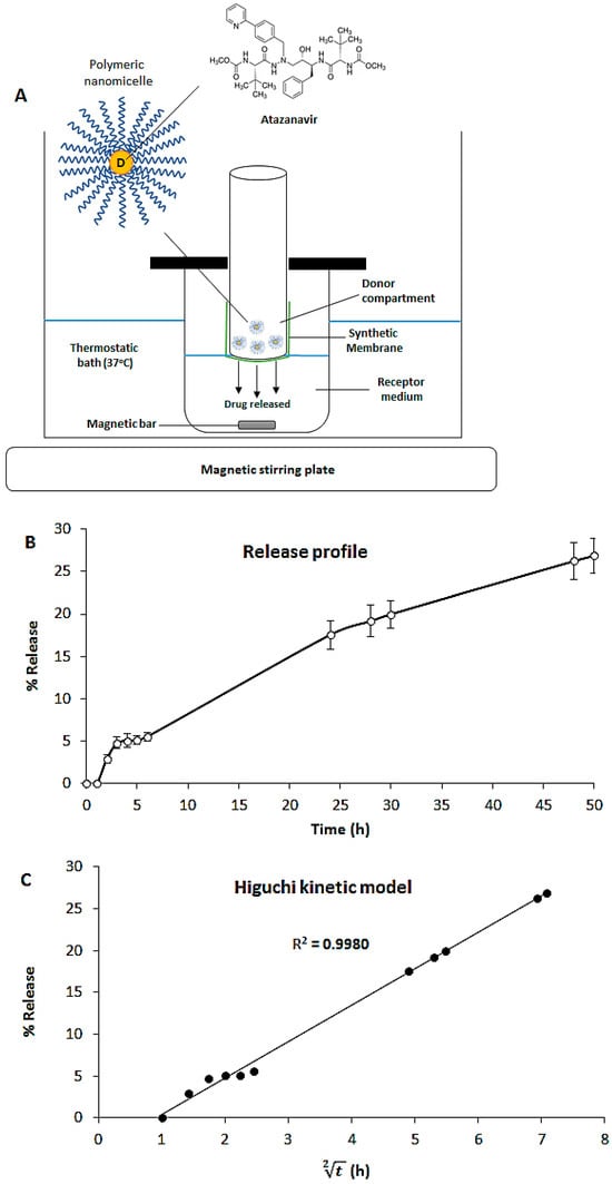 Before starting the in vitro release study, the spectrophotometric method was validated. The maximum absorption of the antiviral in sodium phosphate buffer solution containing a solubilizing agent was 248 nm, which corroborates the wavelength for ATV found in the literature []. The polymeric nanomicelle solution without the antiviral showed small absorption at 190 nm. Therefore, there are no interferences for the quantification of ATV (λ = 248 nm) in the presence of polymeric nanomicelles (Supplementary Materials). With spectrophotometric analyses of ATV dilutions, an analytical curve was obtained with a coefficient of determination (R2) greater than 0.99, which confirms the linearity of the method as shown in Figure S2 (Supplementary Materials). Thus, it was possible to calculate the percentage of antiviral released from the nanomicelles for each time interval.