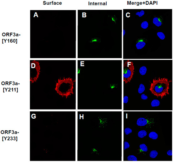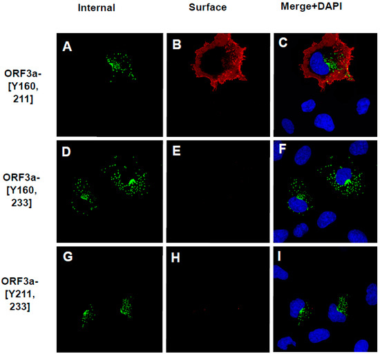 3.6. The Surface Immunostaining of Cells Transfected with Vectors Expressing the ORF3a and ORF3a Mutants Confirms the Cell Surface Expression Patterns