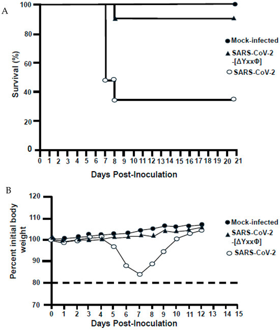 3.11. A SARS-CoV-2 Virus with All Three Tyrosine Motifs Removed (SARS-CoV-2-[ORF3a-[ΔYxxΦ]) Was Less Pathogenic in K18-hACE2 Mice