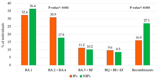 A different prevalence of the five major Omicron lineage groups appeared when comparing the IPs and NIPs groups. In particular, the BA.2 + BA.4 lineages were more common in IPs compared to NIPs (30.9% vs. 17.8%, respectively; p = 0.011). Conversely, Recombinant lineages were less prevalent in IPs than in NIPs (16.0% vs. 27.1%, respectively; p = 0.018) (Figure 2).