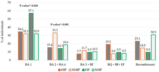 Looking at potential differences in lineage distributions against the four categories HIP, NHIP, HP, and NHP, the Omicron lineages BA.1 was more predominant in HP than others (57.1% in HP vs. 34.6% in HIP vs. 32.1% in NHIP vs. 32.0% in NHP, p = 0.020), while BA.2 + BA.4 lineages were prevalently found in NHIP with respect to others (33.3% in NHIP vs. 15.4% in HIP vs. 14.3% in HP vs. 18.6% in NHP, p = 0.001). Furthermore, a slightly increased frequency of BQ + BE + EF lineages was observed in HIP with respect to the others (19.2% in HIP vs. 8.0% in NHIP vs. 9.5% in HP vs. 8.2 in NHP, p = 0.062. (Figure 3).