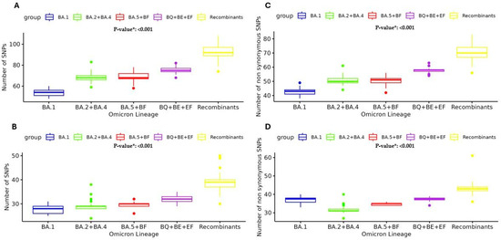 Moreover, the analysis of the number of SNPs with a mutated reads frequency ≥ 20% (cut-off corresponding to the Sanger method) was performed in the five main Omicron lineage groups. The analysis of non-synonymous SNPs ≥ 20% presented the same median [IQR] increase: 43 [41–44] in BA.1 vs. 50 [49–52] in BA.2 + BA.4 vs. 51 [49–52] in BA.5 + BF vs. 58 [57–59] in BQ + BE + EF vs. 70 [68–75] in Recombinants, p < 0.001 (Figure 4C). Similarly, the analysis of non-synonymous SNPs in Spike showed the median [IQR]: 27 [25–28] in BA.1 vs. 27 [27–28] in BA.2 + BA.4 vs. 29 [28–29] in BA.5 + BF vs. 31 [30–31] in BQ + BE + EF vs. 37 [31–38] in Recombinants, p < 0.001 (Figure 4D).