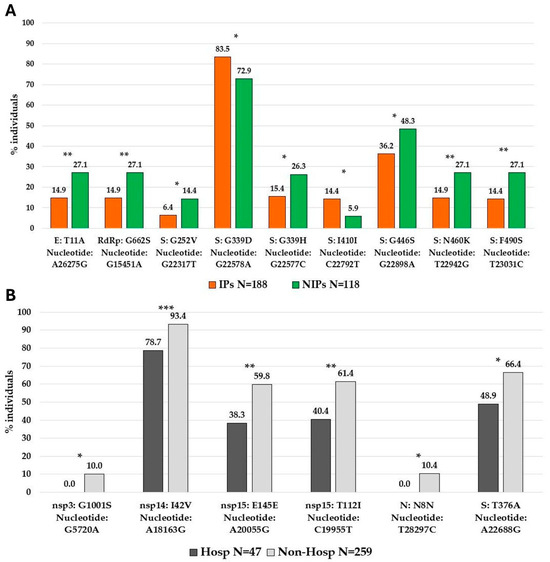 SNPs differences observed between IPs and NIPs, and Hospitalized and Non-Hospitalized individuals. Prevalences of 9 high-abundant SNPs found in IPs vs. NIPs (A) and of 6 high-abundant SNPs in hospitalized vs. non-hospitalized individuals (B). SNPs single nucleotide polymorphism. Prevalences are expressed as N (%). p-values were calculated by Chi-square test or Fisher’s exact test, as appropriate, and indicated by stars * p < 0.05; ** p < 0.01; *** p < 0.001.