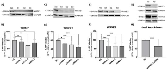 siRNA-mediated knockdown of WAVE1 and WAVE2 inhibits HPV16 infection in HeLa cells. On day 0, HeLa cells were seeded and transfected with siRNA in a 6-well microplate. On day 2, cells were collected and seeded onto a 24-well microplate to establish technical replicates. On day 3, cells were infected with HPV16 PsVs (TCID30) containing a GFP reporter plasmid for 48 h. Protein expression for (A) WASP, (C) WAVE1, (E) WAVE2 or (G) WAVE1 and WAVE2 was measured via Western blotting on day 5. NC was the negative control siRNA used in this study, while S1, S2, and S3 refer to each of three separate siRNAs used to target the indicated proteins. For panels (G,H), S2 targeting WAVE1 and S3 targeting WAVE2 were employed to achieve knockdown of both proteins. Half volumes of each siRNA were combined for transfection so that the final concentration of siRNA in each experiment remained consistent. The percentage of HPV16 infected cells was also determined on day 5 (48 h post-infection) via flow cytometry for the knockdowns of (B) WASP, (D) WAVE1, (F) WAVE2, or (H) both WAVE1 and WAVE2. Each bar represents three biological replicates comprising technical triplicates and shows the mean %GFP+ cells ± standard deviation (n = 3, normalized to WT). One-way ANOVA with Dunnett’s multiple comparison test was used to statistically determine significance (ns = not significant, * p < 0.05, ** p < 0.01, *** p < 0.001, **** p < 0.0001).