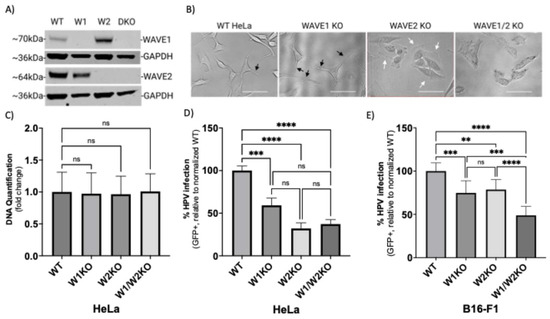 Phase-contrast imaging of cells revealed profound morphological deviations from wild-type morphology, indicating that loss of WAVE proteins affected cytoskeletal arrangement (Figure 2B). Compared to wild-type HeLa cells, WAVE1-knockout HeLa cells (W1KO) harbored more long, narrow projections (Figure 2B, black arrows). In contrast, WAVE2-knockout cells (W2KO) and the double knockouts (W1–W2KO) lacked projections and instead exhibited wide lamellipodial surfaces at the cellular periphery in W2KO cells (Figure 2B, white arrows) or constitutively active blebbing in double knockouts (Figure 2B, last image). While individual cells in WT and W1KO cell populations do not associate closely in proximity until high confluency, W2KO and W1/W2KO cells form colonies of 3–5 cells at any confluency and never establish a uniform sheet-like culture at high confluency as WT cells do. As actin polymerization is an essential function for cell survival, we tested the ability of knockout cells to proliferate normally. All knockout cell populations proliferated at an equal rate to WT cells as determined by the CyQUANT cell proliferation assay (Figure 2C), which is particularly of note in the context of the blebbing W1/W2KO cells, which seems to be unassociated with apoptosis. Blebbing in nonapoptotic cells has been described in the literature, although it is not a well-characterized phenotype [42,43,44]. Knockout of WAVE1, WAVE2, or both proved to impair HPV16 infection in HeLa cells more severely (Figure 2D). While infection in W1KO cells was about 45% reduced compared to WT, knockout of WAVE2 caused a greater reduction of infection, reducing by 68% relative to WT. Importantly, there was no statistically significant difference determined between infection rates among knockout cell populations. To confirm these findings in a different cell line, we utilized B16-F1 melanoma cells lacking WAVE1, WAVE2, or both, generated by the Bruce Goode Laboratory. The resulting infection assays achieved similar results as in HeLa cells, with a significant reduction of infection in knockouts compared to WT (Figure 2E). However, infection in W1/W2KO B16-F1 cells was significantly lower than W1KO B16-F1 as well as W2KO B16-F1.