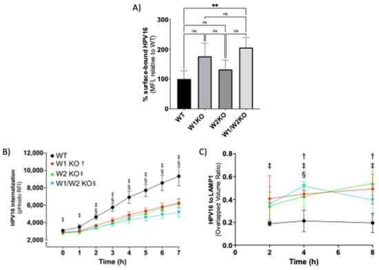 W1KO, W2KO, and W1/W2KO increase HPV16 surface binding, reduce rate of internalization, and increase trafficking of particles to the lysosome. (A) To assess the ability of HPV16 to bind its coreceptors, WT or KO cells were cooled to 4 °C for 0.5 h to inhibit endocytosis. Cells were then transferred to ice and saturated with HPV16 L1L2 VLPs (10 µg/1 × 106 cells) in serum-free media for 1 h at 4 °C. Cells were collected via scraping over ice and then subjected to immunostaining. The quantity of surface-bound HPV16 was analyzed by flow cytometry. Results show the mean fluorescent intensity (MFI) ± standard deviation, normalized to WT. (B) Cells were treated with pHrodo-labeled HPV16 L1L2 VLPs (5 µg/1 × 106 cells) for 7 h at 37 °C and measured each hour via plate reader (BMG Labtech). Results show the mean MFI ± standard deviation. (A,B) represent three biological repeats comprising technical triplicates. (C) Cells were cooled to 4 °C for 0.5 h prior to the addition of HPV16 L1L2 VLPs (0.5 µg/1 × 106 cells) diluted in ice-cold media and incubated together at 4 °C for 1 h. Next, cells were transferred to 37 °C for either 2, 4, or 8 h and subsequently fixed with 4% paraformaldehyde. Sample next underwent immunostaining for LAMP1 and HPV16, with a nuclear counterstain (DAPI). At least 5 Z-stacks were imaged via confocal microscopy from each of 3 biological repeats (~15 Z-stacks total per sample type with a minimum of 15 cells per condition). The quantification of the extent of colocalization between HPV16 and LAMP1 was measured by determining the overlapped volume ratio of voxels using Imaris. Results are depicted as the mean overlapped volume ratio ± standard deviation. Statistics: (A) 1-way ANOVA with Dunnett’s multiple comparison test was used to statistically determine significance (ns = not significant, ** p < 0.001). For (B,C), multiple unpaired t-tests were conducted using the Holm–Šídák method for each time point between WT and KOs. †, ‡, §, symbols correspond to W1KO, W2KO, and W1/W2KO, respectively, and indicate p < 0.05.