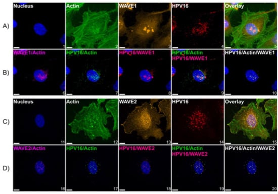 3.1. Wiskott–Aldrich Syndrome Protein Family Members 1 and 2 (WAVE1 and WAVE2) Are Critical for the Infection of HPV16 in HeLa Cells
